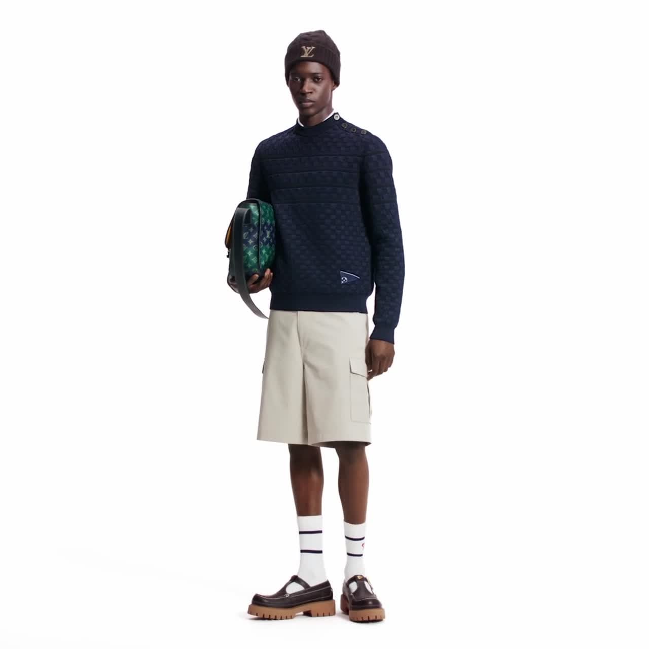 Crafted from certified merino wool, this elegant navy blue pullover is distinguished with a textured allover Damier knit. Discreet horizontal stripes lend a sporty accent to the upper body, while an embroidered signature LV Pennant flag above the left hem recalls this collection’s varsity sports theme. Black buttons in golden settings along the left shoulder add a chic finishing touch.
