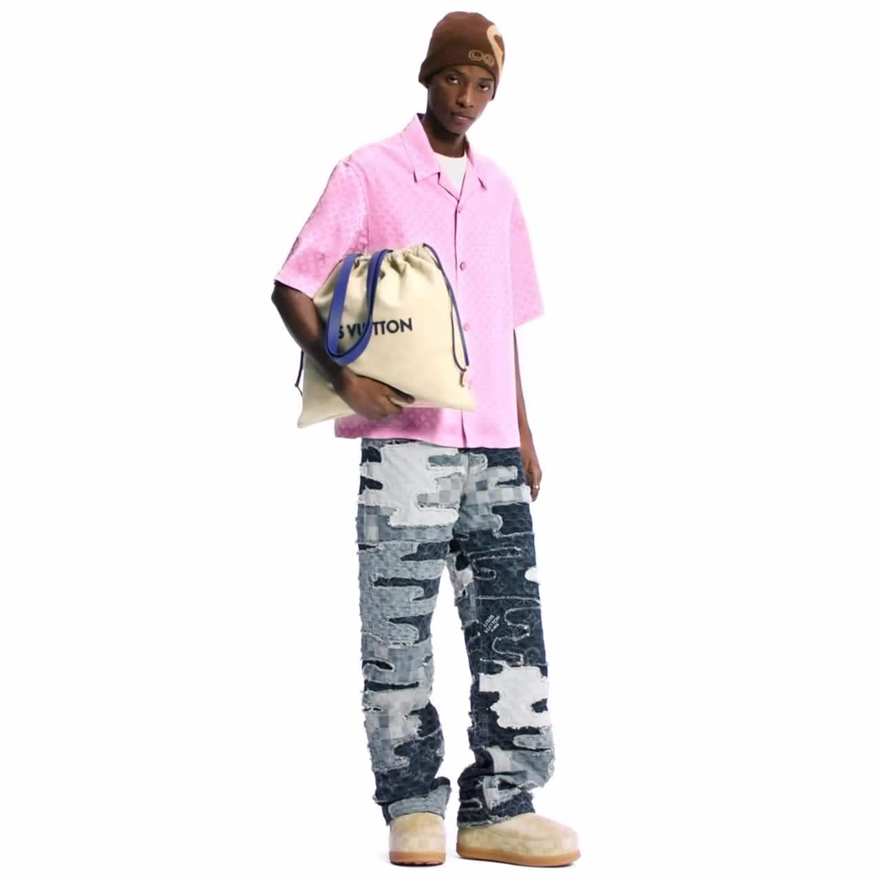 Bagian dari peragaan busana koleksi Fall-Winter 2025, kemeja lengan pendek berwarna pale pink ini menghadirkan nuansa musim panas dengan bagian leher bermodel open collar. Dibuat dari material kain mengilap dengan tenun jacquard, desainnya menampilkan corak Dandy Monogram berwarna senada hasil kolaborasi Pharrell Williams dan Nigo pada musim ini, yang terinspirasi motif geometris khas negara asal Nigo, Jepang. Kemeja bergaya kasual ini mudah dipadupadankan serta dilengkapi kancing beraksen mother-of-pearl berkilau.