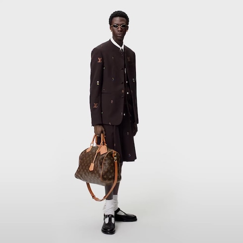 Speedy Bandoulière 40 hadir dalam bahan grained calfskin alami yang lentur, serta tekstur sangat halus. Tas kreasi Creative Director Pharrell Williams ini berhiaskan motif Monogram yang dicetak di atas permukaan kulit dengan teknik silk-screen canggih, sehingga menghasilkan Monogram dengan tampilan pudar seperti tercetak di atas canvas. Seluruh lapisan lining tas ini terbuat dari bahan lambskin leather yang sangat mewah.