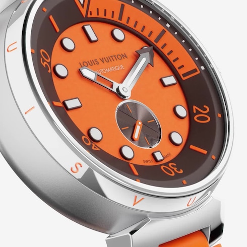 Tambour Street Diver menghadirkan kreasi Louis Vuitton dengan sentuhan sporty. Penunjuk waktu buatan Swiss ini dilengkapi dengan fitur jam tangan diving disertai detail unik khas Rumah Mode. Desain yang fungsional sekaligus berkesan vintage diwujudkan melalui pilihan warna oranye cerah yang mudah terlihat di bawah permukaan air. Sementara strap berbahan karet yang berhiaskan tulisan signature khas Rumah Mode membuat tampilannya lebih memikat.