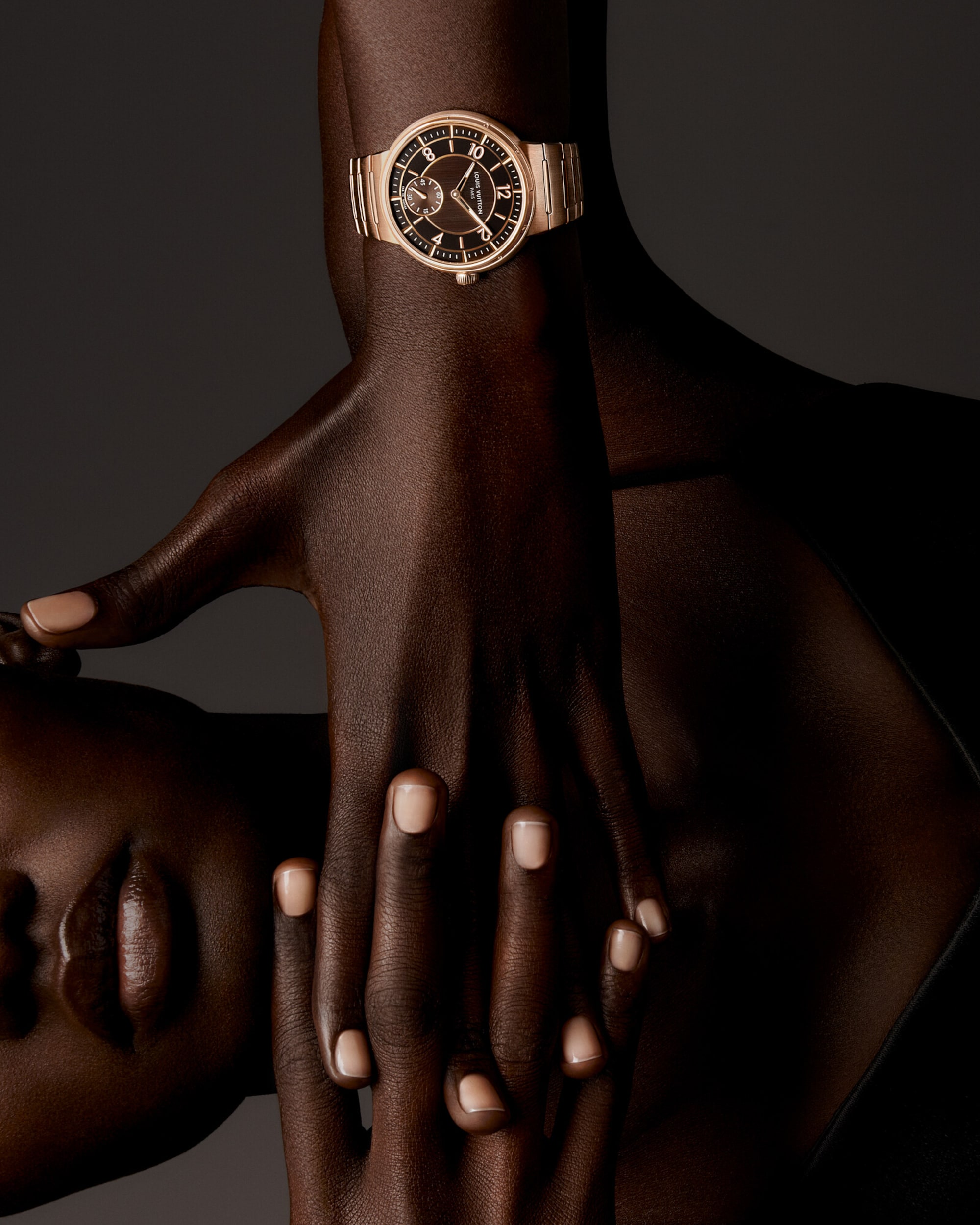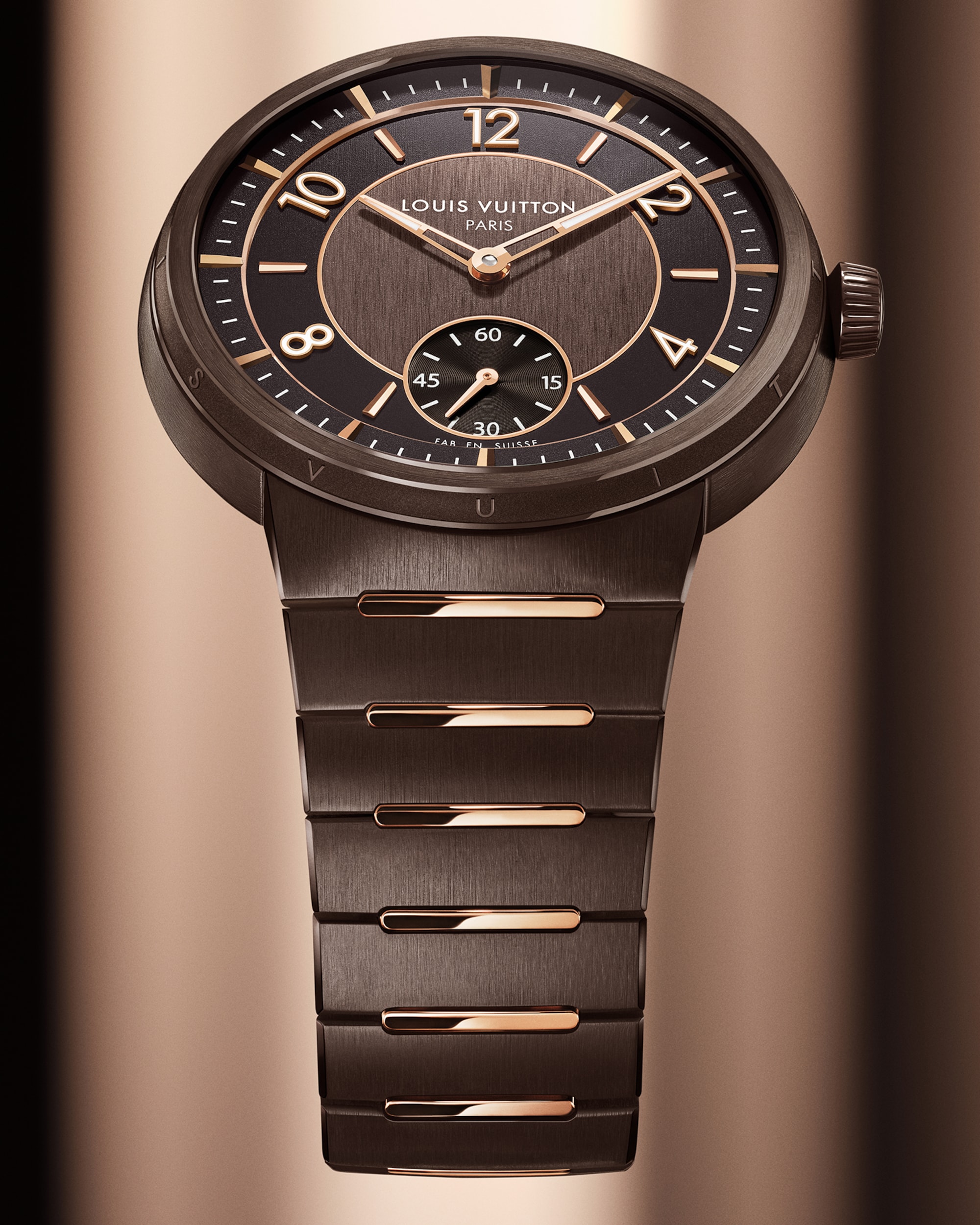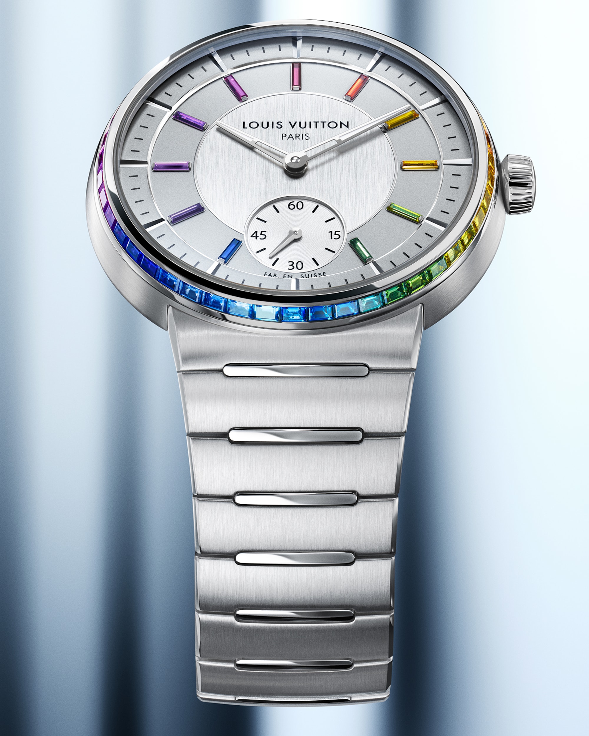 Dalam perpaduan keterampilan ala Swiss dan gaya Paris yang diwariskan turun-temurun dari Rumah Mode, iterasi terbaru Tambour dihiasi dengan signature ganda gaya baru yang simbolis pada dial jamnya: Louis Vuitton Paris dan Fab. en Suisse.