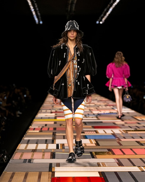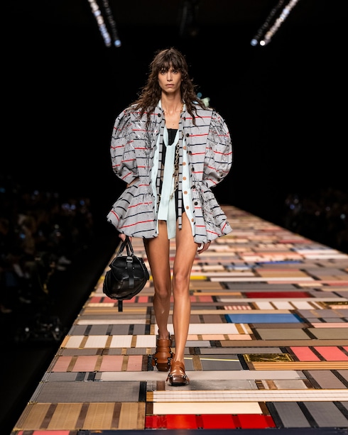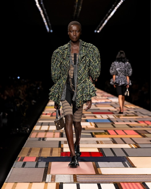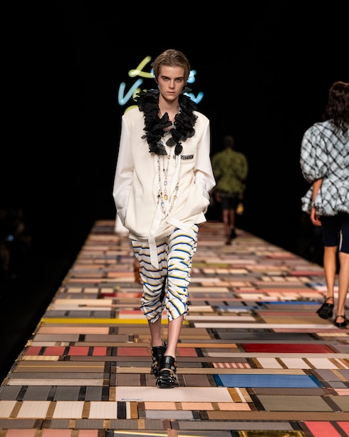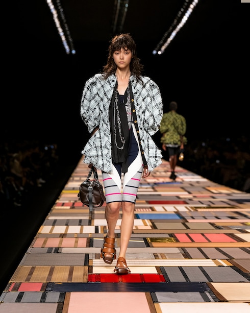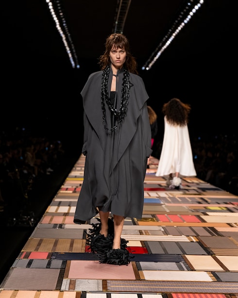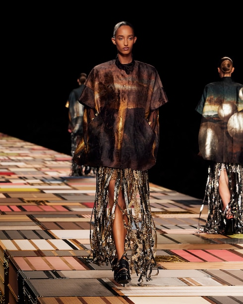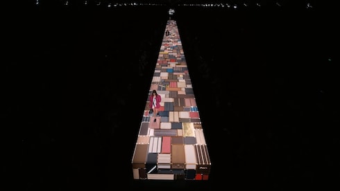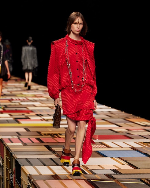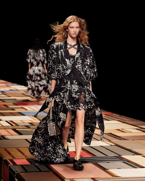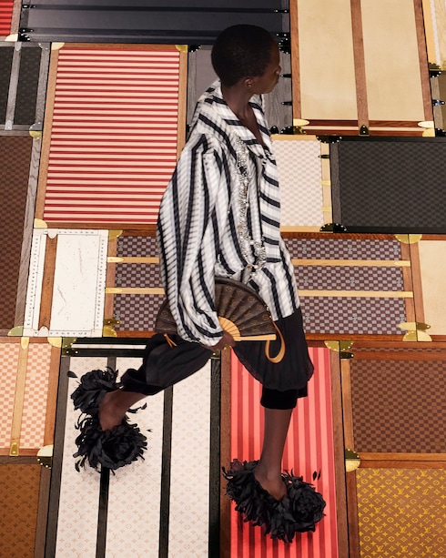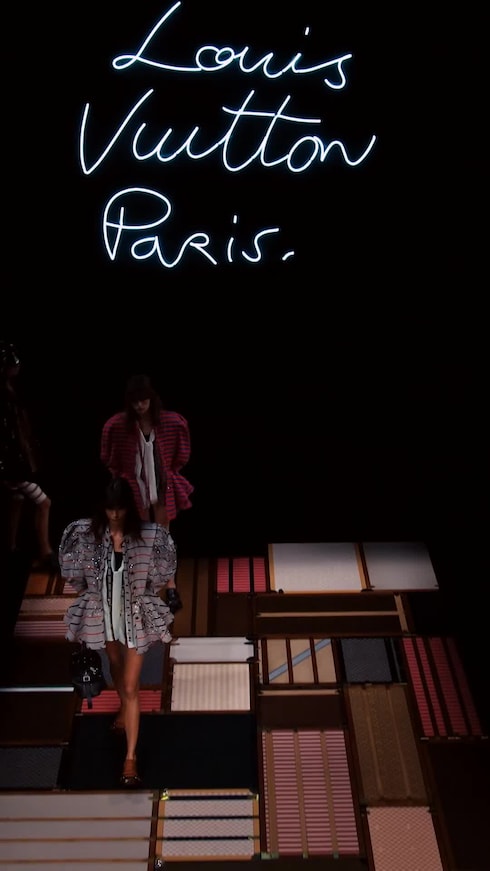 Được làm từ hàng nghìn chiếc rương tạo thành một thiết kế vững chãi, sàn diễn tôn vinh lịch sử lâu đời của Maison, đặt phía trước cấu trúc gương đồ sộ phản chiếu kiến trúc hùng vĩ của Cour Carrée du Louvre ở Paris.