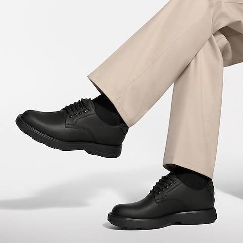 Giày Bastille Derby được làm từ da bê họa tiết Aerogram với đặc tính bề mặt mờ, có vân và độ bền cao - một chất liệu biểu tượng chuyên dùng cho dòng sản phẩm da của Louis Vuitton. Thân trên nổi bật với dây giày bằng vải dệt cùng chi tiết trang trí ở phía sau bằng cao su Neoprene có dập nổi họa tiết Damier. Đế ngoài bằng cao su to bản nhưng nhẹ tênh, điểm xuyết chữ Vuitton ở bên hông, hoàn thiện tổng thể.