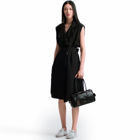 Mẫu đầm lụa Crepe de Chine sang trọng ghi dấu ấn với phom dáng hai hàng khuy tinh tế, kết hợp ve áo nhọn điểm xuyết mô típ hoa Monogram trên đường viền. Thiết kế trông nổi bật hơn với thắt lưng to bản cùng tông màu và đường xẻ tà phía sau.