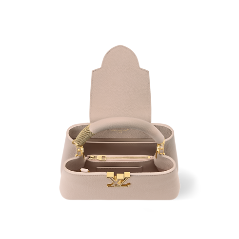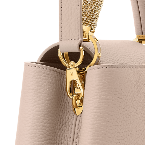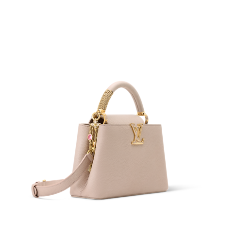Thuộc bộ sưu tập LV Mirage, túi Capucines BB được làm từ da Taurillon cao cấp với tông màu nâu Desert Sand thanh lịch. Thiết kế hai kiểu mang được tô điểm bằng logo LV, phụ kiện đính đá trang trí đồng điệu, và chi tiết màu vàng ánh kim trên tay cầm. Bên trong túi được trang bị nhiều ngăn tiện dụng và có thể biến tấu linh hoạt theo nhiều phong cách khác nhau.
