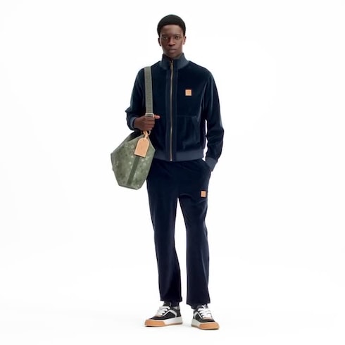 Quần dài dáng thể thao này được nâng tầm với chất liệu nhung xanh thẫm sang trọng, kết hợp các chi tiết vải nhung tăm cùng màu ở phần túi tạo điểm nhấn hài hòa và sang trọng. Đầu dây rút được trang trí bằng chi tiết hiệu ứng ngọc trai, toát lên nét lịch lãm tinh tế, trong khi nhãn da màu VVN in logo Marque L. Vuitton Déposée nổi bật trên ống quần trái. Sản phẩm có thể kết hợp cùng áo khoác đồng bộ để hoàn thiện tổng thể vừa thoải mái vừa thanh lịch.