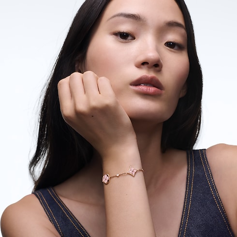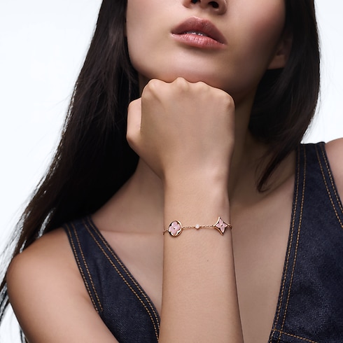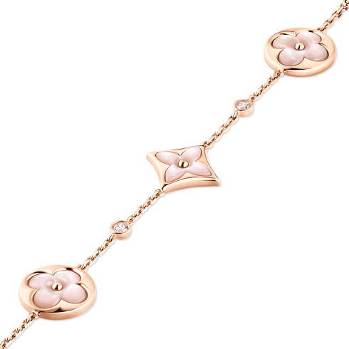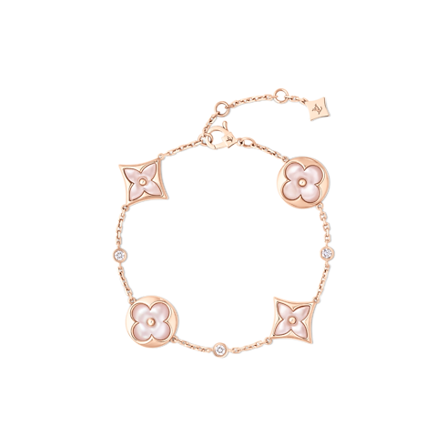 Mẫu trang sức Color Blossom tôn vinh hoa Monogram biểu tượng do con trai của nhà sáng lập, Georges-Louis Vuitton, thiết kế vào năm 1896. Mẫu vòng tay quý giá từ vàng hồng 18K sở hữu mô típ ngôi sao và Mặt Trời được chạm khắc từ ngọc trai vỏ hồng và đánh bóng thủ công tinh xảo. Ngoài ra, thiết kế còn điểm xuyết các viên kim cương giác cắt Brilliant đã trải qua nhiều tháng hoàn thiện để đạt được đường cong tinh tế cùng độ lấp lánh hoàn hảo. Phụ kiện thanh lịch này có thể kết hợp cùng các sản phẩm khác trong cùng bộ sưu tập.