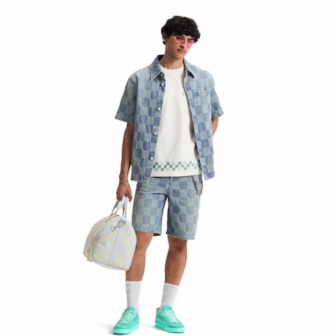 Được may từ vải Denim có hiệu ứng bạc màu, mẫu áo sơ mi ngắn tay ghi dấu ấn với họa tiết Damier 3D dệt kiểu Jacquard, lồng ghép dòng chữ Marque L.Vuitton Déposée đặc trưng. Hàng khuy cài hiệu ứng ngọc trai giúp thiết kế thêm phần sang trọng. Áo có thể kết hợp với quần ngắn đồng điệu để tạo nên bộ trang phục mùa hè ấn tượng.