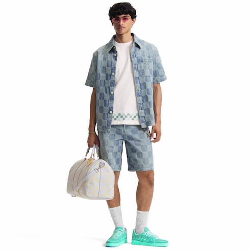 Mẫu quần ngắn màu xanh dương Indigo nhạt được may từ vải Denim dệt sợi Cotton hữu cơ với hiệu ứng bạc màu. Thiết kế trông nổi bật với họa tiết Damier 3D dệt kiểu Jacquard và lồng ghép dòng chữ Marque L.Vuitton Déposée. Trong khi đó, đinh tán và khuy cài hiệu ứng ngọc trai tô điểm nét thanh lịch cho tổng thể. Sản phẩm dễ dàng kết hợp với nhiều phong cách hoặc cùng áo sơ mi đồng điệu để tạo nên bộ trang phục thời thượng ngày hè.