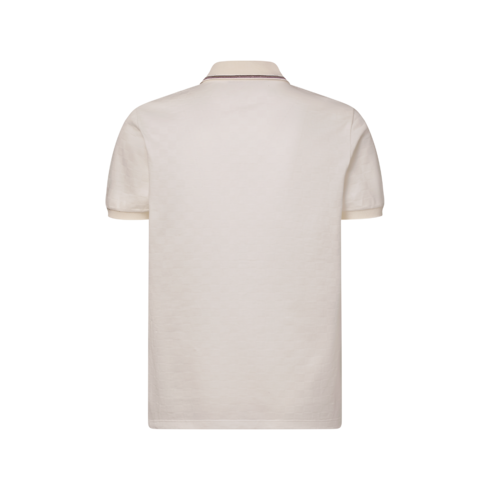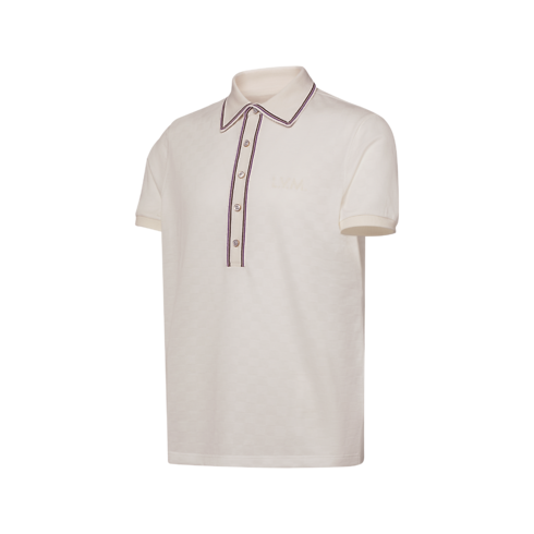 Mẫu áo Polo tinh tế được may từ vải Cotton Piqué màu trắng sữa, tô điểm logo thêu L.V.M cùng tông màu trước ngực cùng mô típ Damier trên toàn bộ nền vải. Cổ áo dệt kim và hàng khuy năm nút thu hút ánh nhìn với họa tiết kẻ sọc màu nâu-đỏ Burgundy tương phản. Trong khi đó, khuy cài ánh xà cừ bọc kim loại màu vàng tạo điểm nhấn theo phong cách Dandy cho tổng thể đậm chất Preppy.