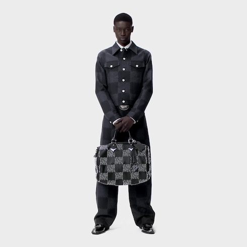 Được may từ vải len dệt kiểu Jacquard, mẫu quần dài thanh lịch mang đến cảm giác thoải mái và vẻ ngoài tinh tế. Tái hiện phom dáng quần Jean cổ điển có năm túi, thiết kế nổi bật với mô típ Damier cỡ lớn được in trên nền màu xanh hải quân, lồng ghép dòng chữ “Marque L.Vuitton déposée” ở bên trong. Khuy cài và đinh tán ánh ngọc trai lấp lánh giúp tổng thể thêm sang trọng. Có thể kết hợp quần dài với áo khoác đồng điệu để tạo nên bộ trang phục thời thượng.