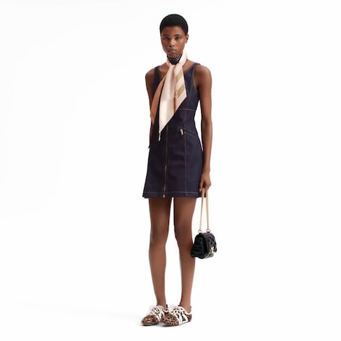 Mẫu đầm dáng chữ A sang trọng được may từ vải Denim sẫm màu, kết hợp hài hòa cùng cổ chữ V nữ tính. Chi tiết khóa kéo chạy dọc thân trước trông nổi bật hơn với đầu khóa bằng chất liệu Monogram Canvas. Thiết kế được hoàn thiện với túi chéo có khóa kéo ở bên hông.