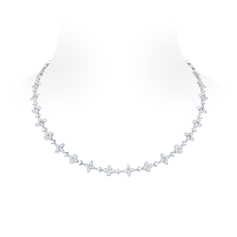 Vòng cổ Dentelle One Row được chế tác từ vàng trắng 18K và đính kim cương thủ công, thuộc bộ sưu tập Dentelle Blossom. Hoa Monogram hiện lên tinh tế qua cấu trúc đan lưới mềm mại, tôn vinh nghệ thuật chế tác trang sức tinh xảo của Louis Vuitton. Thiết kế vượt thời gian nhưng vẫn giữ được nét hiện đại, nâng tầm mọi phong cách.