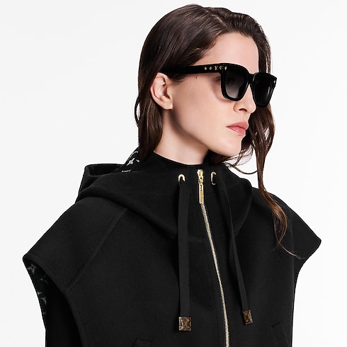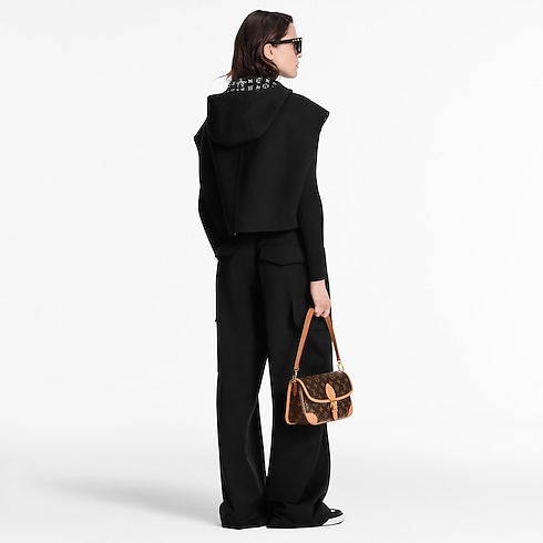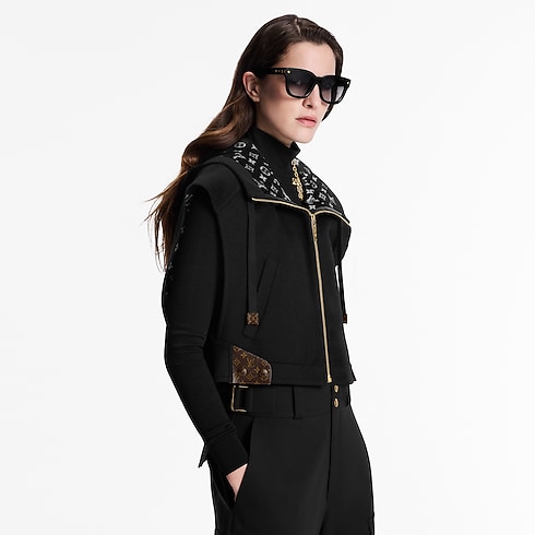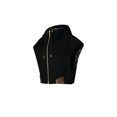 Mẫu áo khoác năng động được may từ hỗn hợp len-lụa hai mặt, tô điểm mô típ Monogram cùng tông màu ở bên trong. Thiết kế có mũ trùm với dây rút bằng da sang trọng, kết hợp cùng khóa kéo và hai túi tiện dụng.