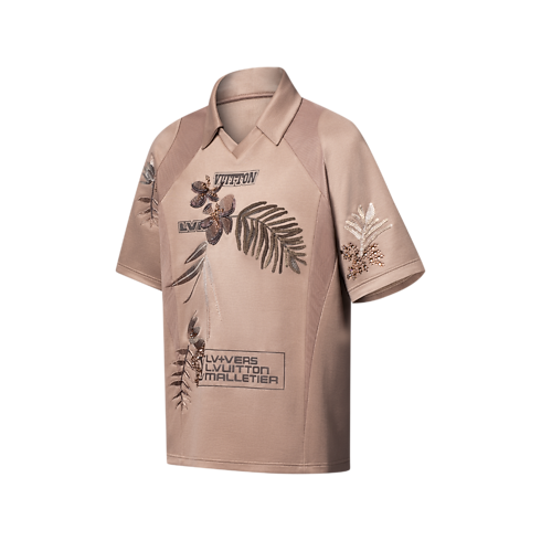 Lấy cảm hứng từ chủ đề bóng đá trong bộ sưu tập Xuân-Hè 2025, mẫu áo thun cổ chữ V toát lên phong cách thể thao năng động cùng với nét tinh tế của nhà mốt Pháp. Thiết kế được may từ vải Cotton Jersey màu nâu sẫm với chi tiết bằng vải lưới, nổi bật với các điểm nhấn cùng tông màu. Trong khi đó, họa tiết thêu hoa lá được đính đá Rhinestone cùng hạt cườm ở thân trước và tay áo. Sản phẩm sẽ kết hợp hài hòa với quần ngắn đồng điệu để tạo nên tổng thể thanh lịch.
