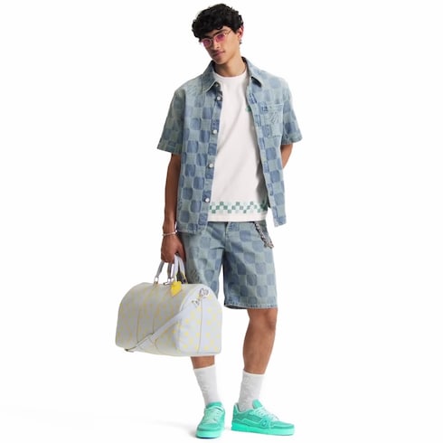 Mẫu áo thun dệt kim được may từ vải Cotton hữu cơ màu trắng sữa, nổi bật với họa tiết Damier đính cườm trên lai áo. Các họa tiết trang trí lấp lánh gây ấn tượng với tông màu xanh nước biển, gợi liên tưởng đến những viên gạch lát trong bể bơi, trong khi logo LV hiệu ứng viết tay tạo điểm nhấn đẹp mắt trước ngực áo.