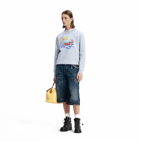Được may bằng vải Cotton mềm mại màu xám nhạt, mẫu áo dệt kim gây ấn tượng với họa tiết thêu rực rỡ xuất hiện trong buổi trình diễn bộ sưu tập Thu-Đông 2025. Mô típ này khắc họa hình ảnh hai người ngồi trên chiếc thuyền câu cá trong khung cảnh yên bình, tôn vinh tình bạn lâu năm giữa Giám đốc sáng tạo Pharrell Williams và nhà thiết kế Nigo. Sản phẩm được hoàn thiện với nhãn da có dòng chữ Marque L.Vuitton Déposée ở phía sau.