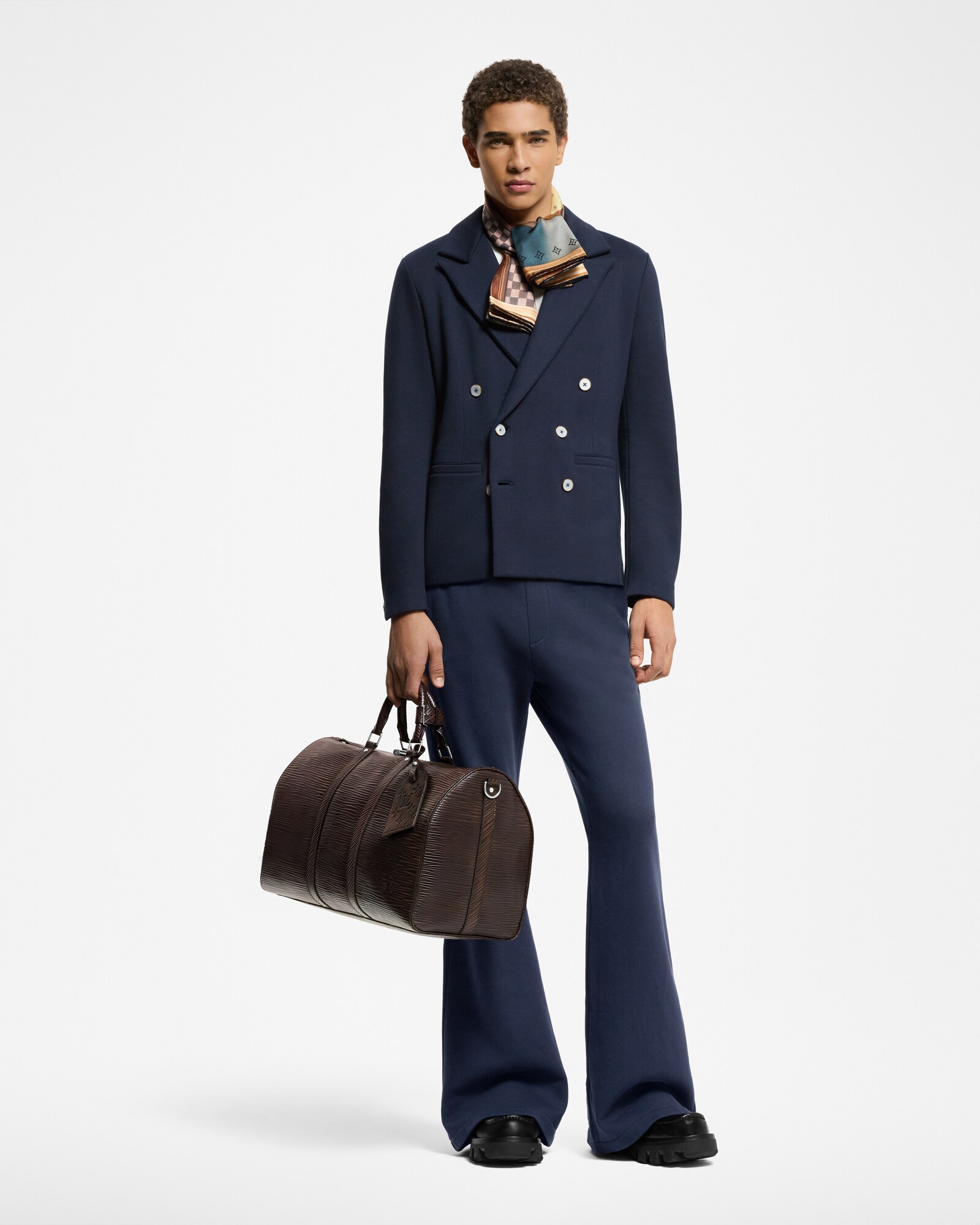 Mẫu quần dài ống loe được may từ hỗn hợp vải Cotton-Cashmere Jersey màu xanh hải quân mềm mại và sang trọng. Thiết kế có cạp quần bo vải sọc gân, kết hợp với dây rút có nút chặn bằng kim loại màu vàng và đính hạt ngọc trang trí. Sản phẩm dễ dàng kết hợp với áo khoác đồng điệu để tạo nên bộ trang phục thời thượng.