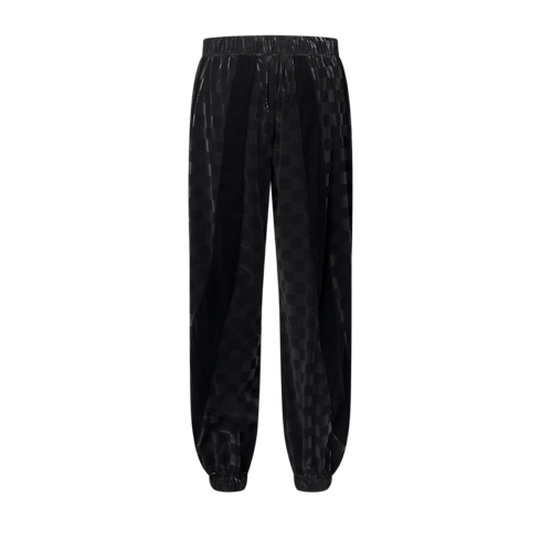 Thuộc bộ sưu tập Xuân-Hè 2025, mẫu quần dài dáng thể thao thời thượng được may từ vải kỹ thuật màu đen có bề mặt bóng, tô điểm họa tiết Damier mờ và lồng ghép dòng chữ Marque L.Vuitton Déposée. Thiết kế còn có hai đường trang trí bằng vải nhung mềm mịn, kết hợp hài hòa với mẫu áo đồng bộ để tạo nên tổng thể thoải mái khi đi du lịch.