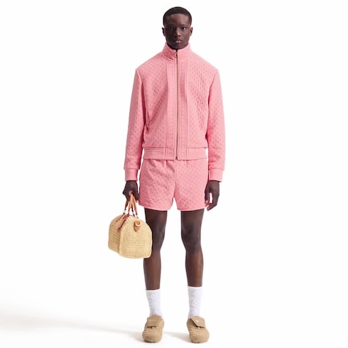 Mẫu áo khoác màu hồng nhạt được may từ vải French Terry bằng sợi Cotton hữu cơ, tô điểm họa tiết LV Scarp dệt kiểu Jacquard theo phong cách Art Deco. Các dấu ấn của Maison được thể hiện qua mô típ hoa Monogram, dải logo LV và các chi tiết đặc trưng khác. Thiết kế có thể kết hợp hài hòa với quần ngắn đồng điệu để tạo nên bộ trang phục ấn tượng khi thư giãn bên bể bơi.