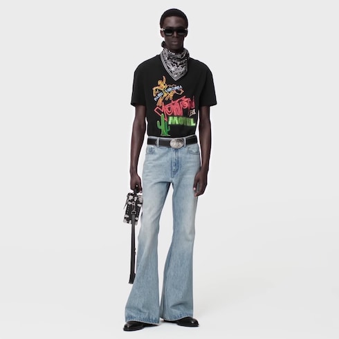 Được may từ vải Cotton màu đen, mẫu áo thun cơ bản khoác lên diện mạo mới vớimô típ Vuitton Motel từ bộ sưu tập Thu-Đông 2024. Điểm nhấn này được in sống động và đính pha lê lấp lánh, gợi liên tưởng đến những thành phố rực rỡ ánh đèn Neon ở miền Tây nước Mỹ. Sở hữu vẻ ngoài thời thượng và bắt mắt, thiết kế là lựa chọn lý tưởng giúp nâng tầm tủ đồ thường nhật mùa hè.