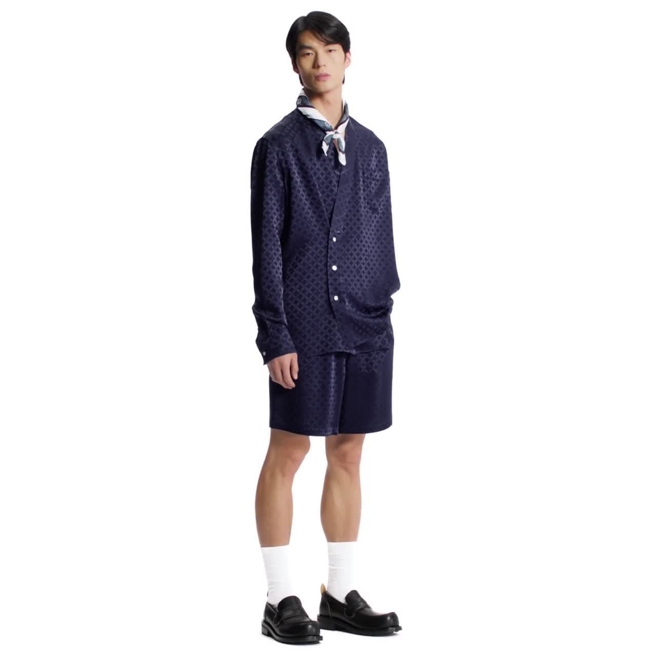 Mẫu áo sơ mi mềm mượt là một mảnh ghép thuộc bộ sưu tập Thu-Đông 2025 do Giám đốc sáng tạo Pharrell Williams hợp tác sản xuất với người bạn thân thiết Nigo. Thiết kế ghi dấu ấn với cổ áo đắp chéo kiểu Kimono Nhật Bản, tô điểm mô típ Dandy Monogram trên nền vải màu xanh dương sẫm dệt kiểu Jacquard. Sản phẩm được hoàn thiện với khuy cài ánh xà cừ tinh tế và nhãn Marque L.Vuitton Déposée ở phía sau.