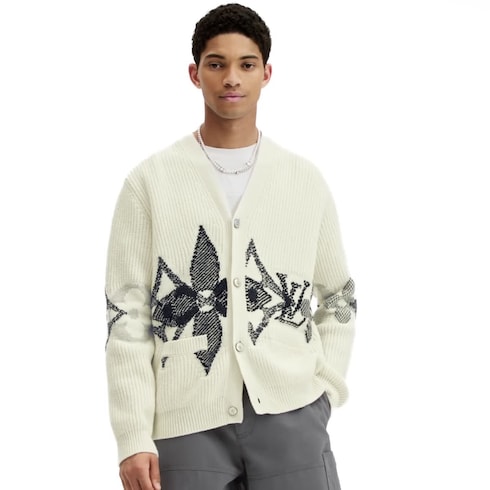 Mẫu áo khoác len ghi dấu ấn với mô típ bông tuyết được cách điệu từ logo LV và bông hoa Monogram biểu tượng, tô điểm trên phần tay và thân áo dưới. Điểm nhấn tinh xảo này được dệt bằng kỹ thuật Intarsia trong gam màu xám-xanh dương giúp tạo nên hiệu ứng tương phản thú vị trên nền vải màu trắng có sọc gân to bản. Thiết kế sẽ là gợi ý lý tưởng cho những buổi tối thư giãn sau một ngày dài chinh phục sườn núi tuyết.