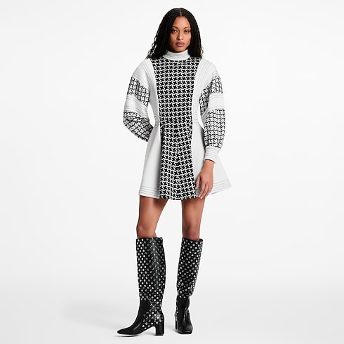 Xuất hiện đầy ấn tượng trên sàn diễn bộ sưu tập Cruise 2026 của nhà mốt Pháp, mẫu đầm thời thượng ghi dấu ấn với mảng họa tiết tổ ong hai màu được dệt kiểu Jacquard, kết hợp tương phản với các điểm nhấn trơn màu điểm xuyết đường khâu diễu năng động. Được may từ hỗn hợp Viscose-len, thiết kế sở hữu phom dáng mang đậm cảm hứng Trung cổ với chi tiết tay phồng, chân váy chữ A mềm mại cùng cổ áo đứng.