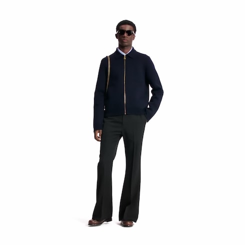 Mẫu áo khoác len dệt kim toát lên nét thanh lịch với họa tiết LV Blason dập nổi tinh tế, kết hợp khóa kéo và hai túi bên hông tiện dụng. Với gam màu xanh dương sẫm, thiết kế sẽ là lựa chọn lý tưởng cho mọi mùa trong năm, dễ dàng phối hợp với nhiều trang phục.
