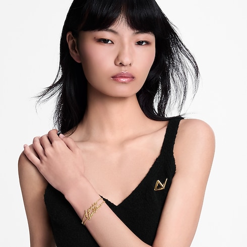 Được đúc từ kim loại màu vàng sáng bóng, vòng tay LV Script nổi bật với chi tiết tên thương hiệu xuất hiện trong phông nền buổi trình diễn bộ sưu tập Xuân-Hè 2025 của nhà mốt Pháp. Thiết kế độc đáo gồm hai sợi dây bao quanh chữ Louis Vuitton được cách điệu theo phong cách viết tay mềm mại. Phụ kiện có thể đeo riêng lẻ hay kết hợp với các trang sức khác, và sẽ là điểm nhấn hoàn hảo cho mọi trang phục.