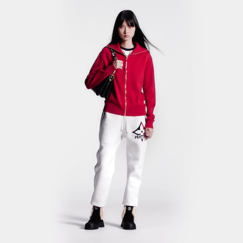 Được may từ vải Cotton Jersey mềm mại, quần dài dáng thể thao toát lên vẻ đẹp trẻ trung với 2 túi có khóa kéo và phần ống quần bo vải sọc gân. Đường khâu diễu màu đỏ và xanh dương gợi nhớ đến bộ 3 màu sắc trên quốc kỳ Pháp, trong khi mô típ LV Snowflake to bản trên phần hông bên trái hoàn thiện vẻ ngoài năng động.