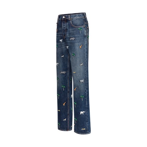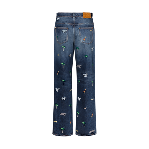 Mẫu quần Jean này nổi bật nhờ họa tiết Louis Vuitton x The Darjeeling Limited biểu tượng từ bộ sưu tập Xuân-Hè 2026 với những hình thêu sống động của cây cọ và động vật trên toàn bộ bề mặt. Trong khi đó, các điểm nhấn như chữ L.V.M. trên túi sau bên ph