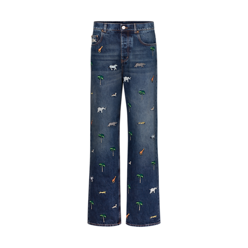 Mẫu quần Jean được tô điểm họa tiết LV x The Darjeeling Limited biểu tượng từ bộ sưu tập Xuân-Hè 2026, nổi bật với những đường thêu sinh động mô tả hàng cây cọ và các loài động vật. Các chi tiết đặc trưng gồm dòng chữ thêu L.V.M. tinh tế trên túi sau bên phải và miếng da Nubuck Jacqueron có hoa văn Mini Damier, tạo điểm nhấn thương hiệu tinh xảo. Sản phẩm có thể kết hợp cùng áo sơ mi đồng bộ để hoàn thiện tổng thể thời thượng.