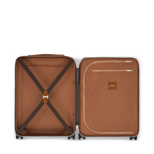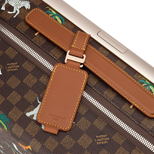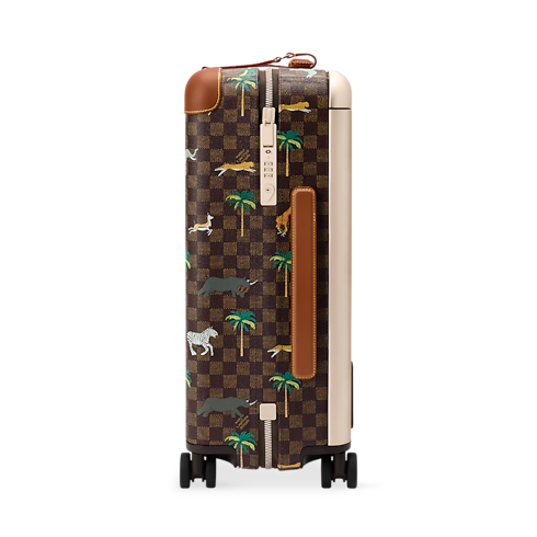 Thuộc bộ sưu tập LV x The Darjeeling Limited, vali Horizon 55 được chế tác từ chất liệu Damier Ebene Heritage Canvas, điểm xuyết họa tiết hình động vật hoang dã từ thảo nguyên. Đường viền bằng da màu nâu ở các góc được gia cố và quai xách tạo điểm nhấn ấn tượng với nền vali màu tối. Sản phẩm đủ nhỏ gọn để mang lên máy bay nhưng vẫn vô cùng rộng rãi.
