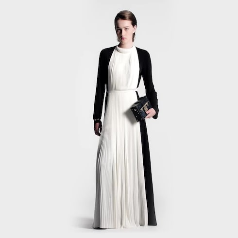 Được may từ vải Viscose Jersey mềm mại, mẫu đầm dự tiệc sang trọng sở hữu phom dáng dài thướt tha, điểm xuyết những nếp xếp ly tinh xảo được tạo nên từ tài hoa chế tác của nhà mốt Pháp. Phần cổ áo cuộn tạo nên hiệu ứng thị giác như món trang sức, trong khi phần hở lưng ở phía sau mang đến cho thiết kế vẻ đẹp trang nhã.