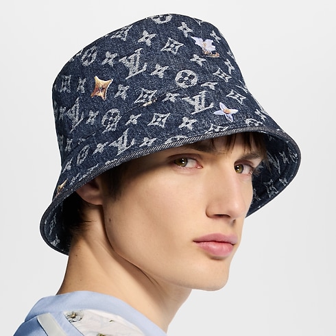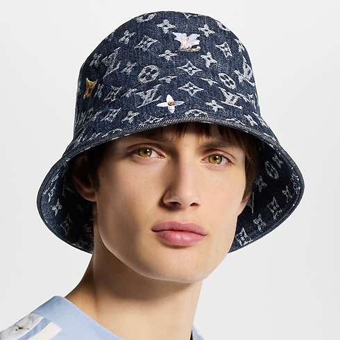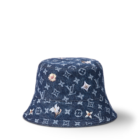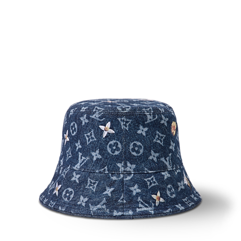 Mẫu mũ Bucket này sở hữu phom dáng thời thượng, điểm xuyết các dấu ấn tinh tế. Thiết kế được may từ vải Denim hiệu ứng bạc màu có in có họa tiết hoa Monogram. Chi tiết thêu hoa màu trắng và vàng giúp thể hiện sự kết hợp hài hòa giữa kiểu mũ nam tính và nét đẹp dịu dàng, thanh nhã.