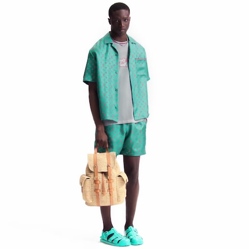 Mẫu áo sơ mi lụa sang trọng ghi dấu ấn với mô típ Monogram Glow màu hồng san hô nổi bật trên nền vải màu xanh biển đậm chất hè. Thiết kế sở hữu phom dáng và cổ áo thoải mái, dễ dàng kết hợp với quần ngắn đồng điệu để tạo nên bộ trang phục thời thượng.