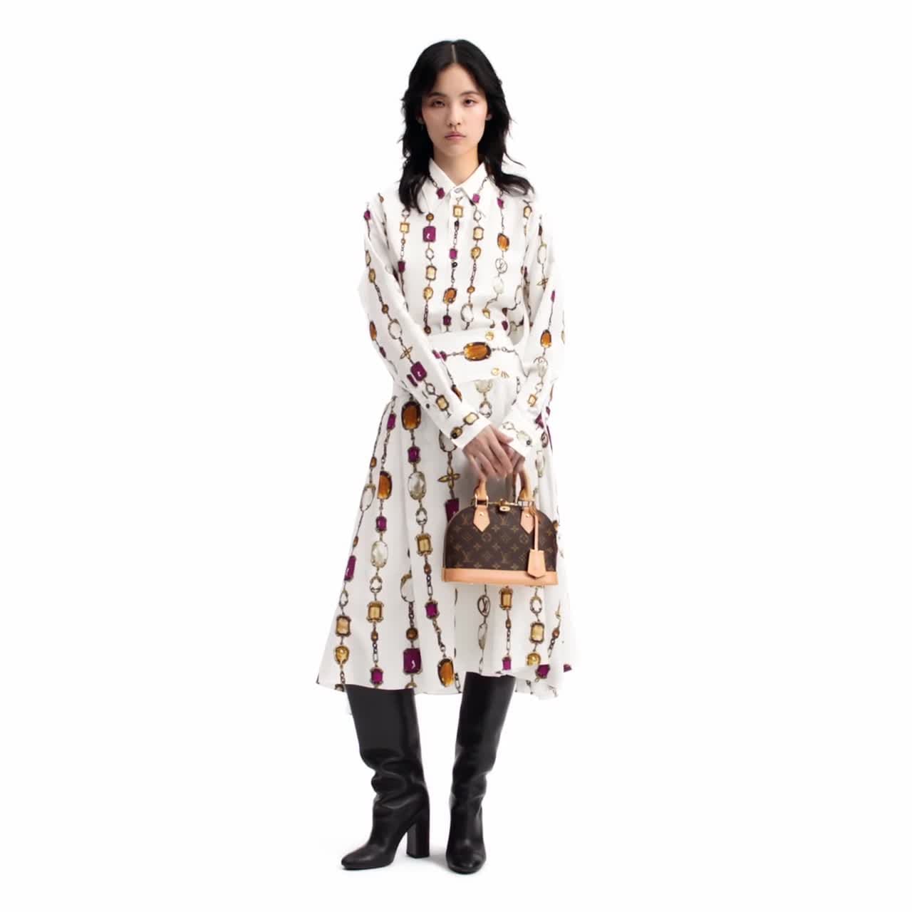 Mẫu váy lửng thanh lịch được may từ vải lụa Crepe de Chine thoáng mát trong tông màu trang nhã, điểm xuyết những đường xếp ly tạo nên tổng thể bồng bềnh. Thiết kế trông ấn tượng hơn với họa tiết vòng cổ tinh xảo, kết hợp thắt lưng co giãn với khuy trang trí màu vàng ánh kim sang trọng.