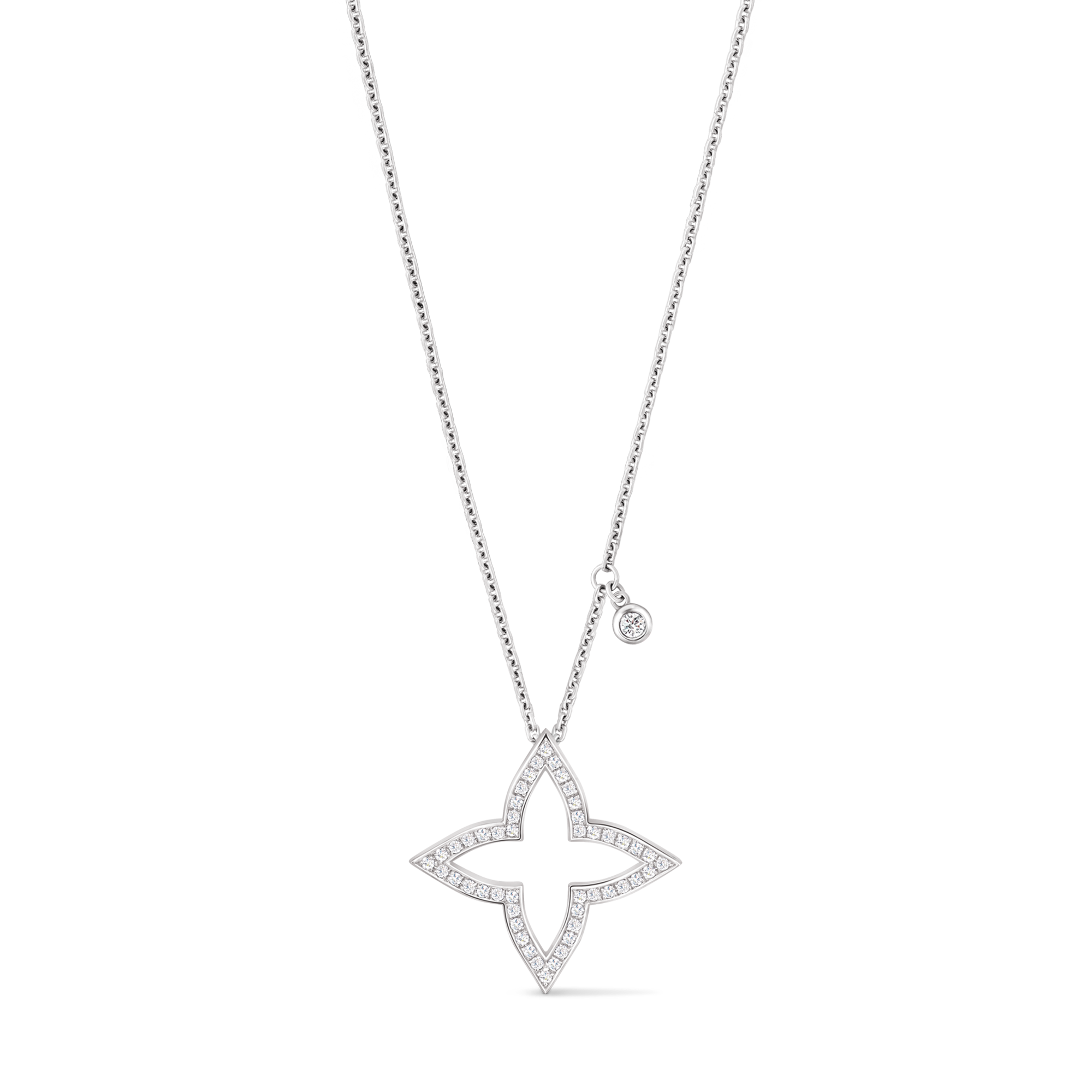 Vòng cổ Louis Vuitton Ombre Blossom thu hút mọi ánh nhìn với thiết kế mở độc đáo. Món trang sức quý giá này mang đến nét biến tấu ấn tượng cho bông hoa kinh điển của Maison, một biểu tượng của tinh thần lạc quan bất diệt. Đóa hoa Monogram cánh nhọn được chế tác bằng chất liệu vàng hồng, điểm xuyết những viên kim cương lấp lánh. Chi tiết trang trí bằng kim cương giúp sản phẩm càng thêm nổi bật.