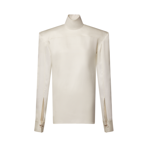 Xuất hiện trong buổi trình diễn bộ sưu tập mùa này, mẫu áo thanh lịch được may từ lụa trong phom dáng tinh giản, tô điểm với phần vai áo ấn tượng và cổ áo đứng. Mặt sau của áo được cut-out để lộ phần vai quyến rũ. Mô típ hoa Monogram quanh cổ tay áo điểm xuyết dấu ấn thương hiệu hoàn thiện tổng thể.