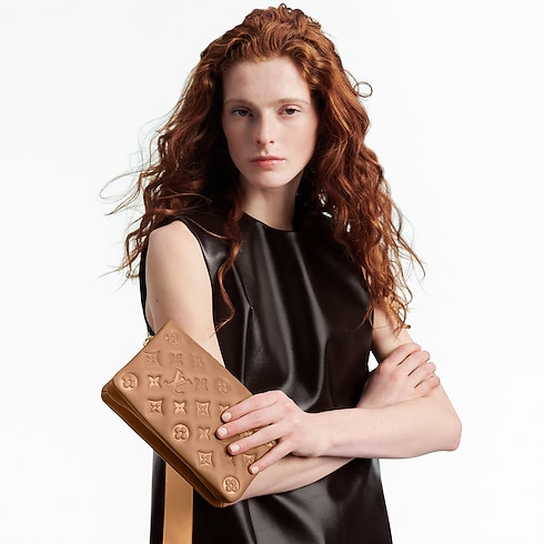 Túi Pochette Coussin được may từ da cừu mềm mại dập nổi họa tiết Monogram, tạo nên hiệu ứng phồng êm ái. Thiết kế có dây xích dễ tháo rời được trang trí phụ kiện có chữ Louis Vuitton, giúp dễ dàng biến hóa nhiều phong cách như cầm tay, đeo trên vai hoặc đeo ngang hông.