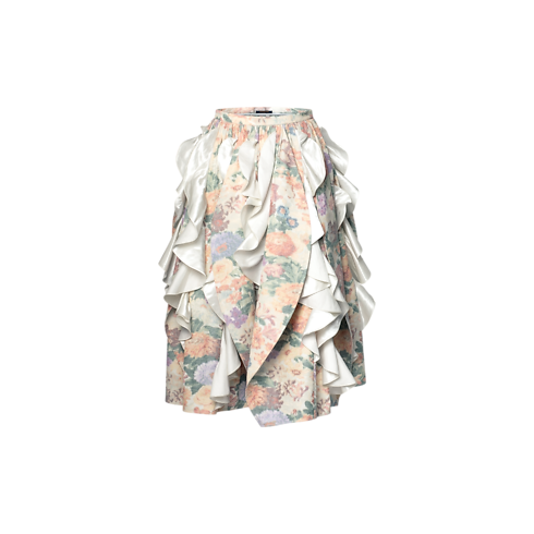 Lấy cảm hứng từ phong cách trang trí nội thất cổ điển, mẫu váy lửng duyên dáng thuộc bộ sưu tập Xuân-Hè 2026 ghi dấu ấn với họa tiết hoa nhã nhặn trên nền vải Canvas dệt từ Viscose và các loại sợi khác. Thiết kế trông ấn tượng hơn với chi tiết nhún bằng vải Satin giúp tạo độ bồng bềnh cho tổng thể.