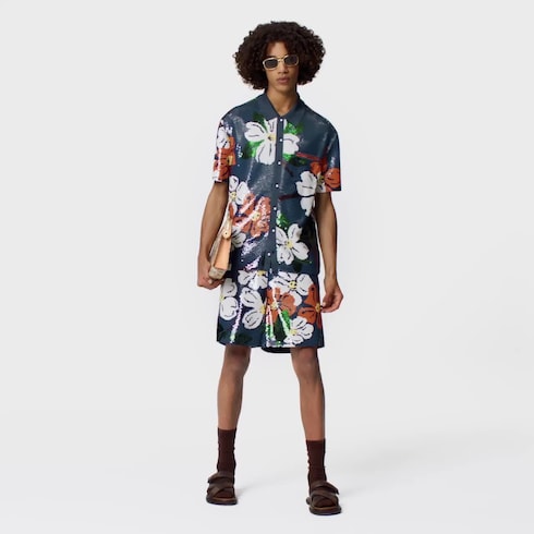 Thể hiện chủ đề thiên đường đảo nhiệt đới, mẫu áo sơ mi quen thuộc trông ấn tượng hơn với mô típ hoa lá được đính xê-quin thủ công. Dòng chữ Louis Vuitton được thêu trên túi áo cùng với hàng khuy có hiệu ứng ngọc trai điểm xuyết nét tinh tế cho tổng thể thiết kế. Áo kết hợp hài hòa với quần ngắn đồng điệu để tạo nên bộ trang phục thời thượng.