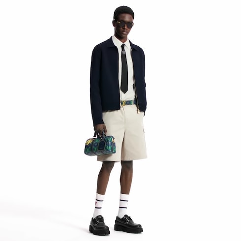Mẫu quần ngắn được may từ vải Cotton màu be nhã nhặn, tô điểm dòng chữ Louis Vuitton Malletier phía trên túi sau bên phải và họa tiết thêu cùng tông màu trên từng túi hộp. Thiết kế thanh lịch được hoàn thiện với với khuy cài ánh ngọc trai tinh tế.