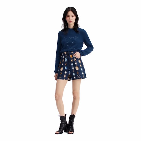 Mẫu áo dài tay được may từ vải Cashmere dệt kim sang trọng trong gam màu nhã nhặn. Thiết kế có phom dáng thoải mái, cổ tròn và lai áo bo sọc gân. Điểm nhấn thương hiệu được thể hiện qua logo LV to bản đính xê-quin lấp lánh ở trước ngực.