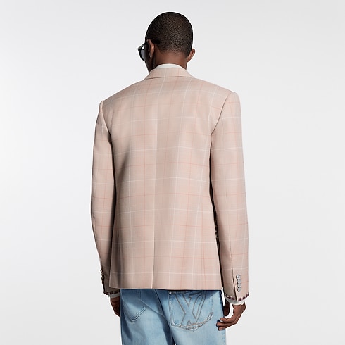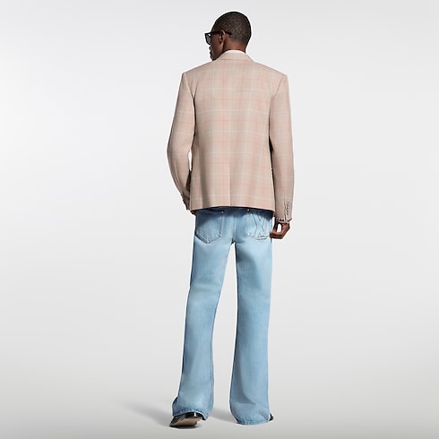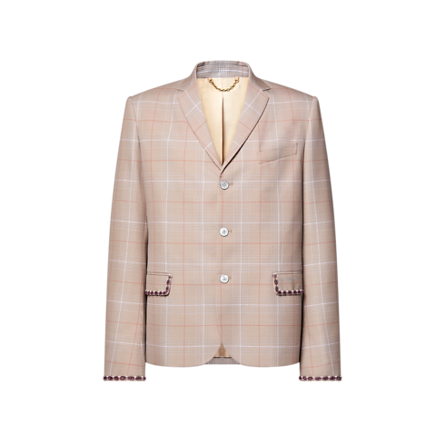Mẫu áo khoác len một hàng khuy thuộc bộ sưu tập Xuân-Hè 2026 này toát lên nét thẩm mỹ tinh tế của phong cách Dandy kiểu Ấn Độ. Được may đo từ vải có họa tiết kẻ ca rô Glen trong gam màu nâu Camel, mẫu áo nổi bật với những hạt cườm được thêu tinh xảo tựa như trang sức trên túi áo và cổ tay áo, cùng dòng chữ thêu Louis Vuitton Paris trên túi áo trái. Thiết kế có thể kết hợp cùng quần dài đồng bộ để tạo nên bộ âu phục thanh lịch.