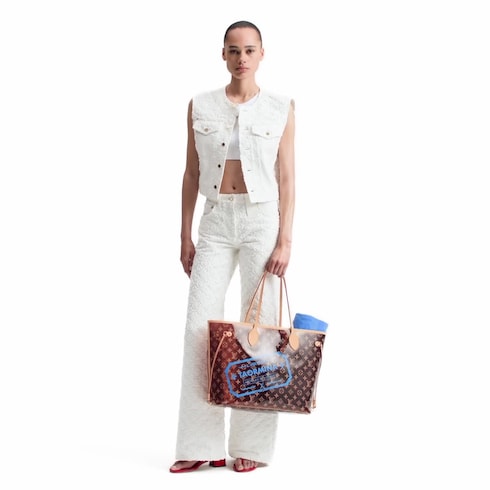 Mẫu áo khoác dáng Boxy được may từ vải Denim màu trắng, điểm xuyết họa tiết Monogram cùng tông màu dệt kiểu Fil Coupé. Vai áo và túi nắp gập được tô điểm các chi tiết bằng vải trơn, trong khi các chi tiết kim loại màu vàng mang đến điểm nhấn tinh tế.