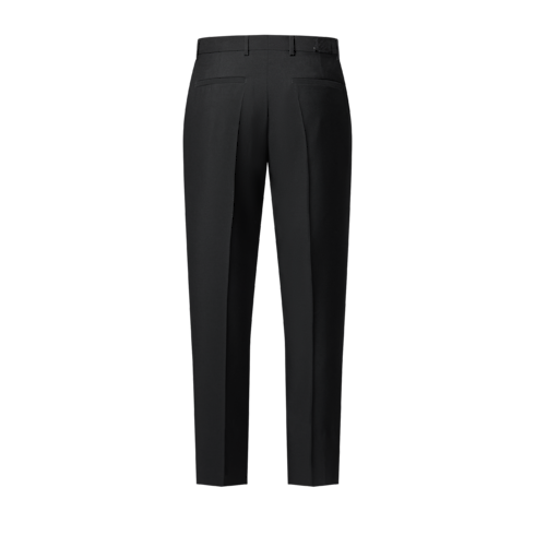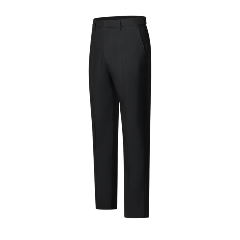 Mẫu quần dài sang trọng màu đen được may từ vải len cao cấp trong phom dáng ôm vừa vặn, tô điểm nhãn dệt có chữ Marque L.Vuitton Déposée cùng tông màu ở mặt sau cạp quần. Thiết kế thanh lịch dễ dàng kết hợp với các mẫu trang phục may đo khác trong cùng bộ sưu tập để tạo nên diện mạo lịch lãm cho buổi tiệc đêm.