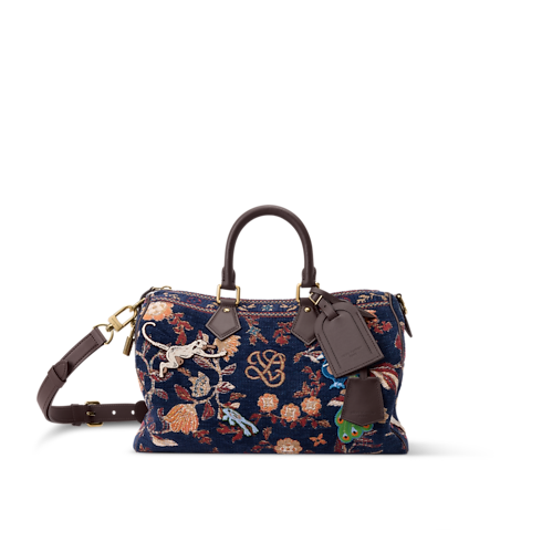 Túi Speedy P9 Bandoulière 30 gây ấn tượng với chất liệu vải dệt kiểu Jacquard, đan xen sợi vải Chenille với các sợi chỉ dọc nhiều màu sắc để tạo nên hiệu ứng như tấm thảm đẹp mắt. Thiết kế trông nổi bật hơn với hình thêu động vật tựa như đang di chuyển ngang thân túi. Sản phẩm được hoàn thiện với đường viền, quai xách và thẻ tên bằng da màu nâu Chocolate, tạo điểm nhấn tương phản với tổng thể.