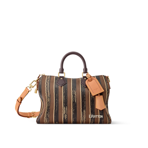 Túi Speedy P9 Bandoulière 30 được Giám đốc sáng tạo Pharrell Williams biến tấu với họa tiết kẻ sọc màu nâu - một trong những hoa văn nguyên bản trên các mẫu rương Louis Vuitton. Thiết kế được điểm xuyết chi tiết trang trí màu nâu Chocolate, kết hợp cùng lớp lót bằng da cừu in mô típ Monogram màu kem sang trọng. Dấu ấn thương hiệu còn được thể hiện qua chữ "L.Vuitton" ở góc túi bên phải.